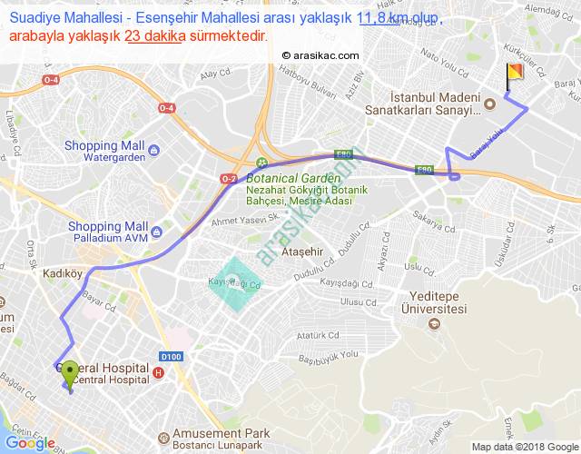 Suadiye Mahallesi - Esenşehir Mahallesi arası yaklaşık olarak 90 km/h ile yukarıda belirtilen sürede olup, iki yerin kuş uçuşu uzaklığı (mesafesi) 8'dir. Yolculuk otobüsle 29 dakika sürmektedir.