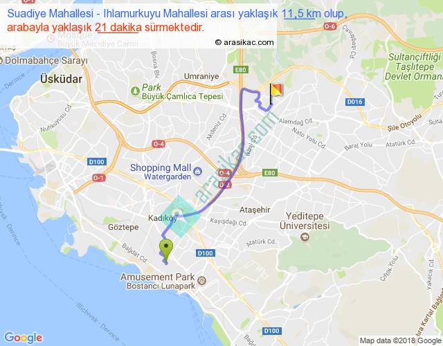 Suadiye Mahallesi - Ihlamurkuyu Mahallesi arası yaklaşık olarak 90 km/h ile yukarıda belirtilen sürede olup, iki yerin kuş uçuşu uzaklığı (mesafesi) 8'dir. Yolculuk otobüsle 27 dakika sürmektedir.