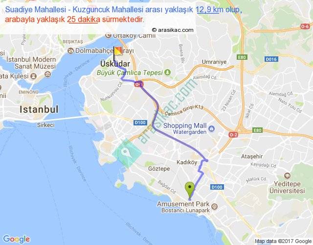 Suadiye Mahallesi - Kuzguncuk Mahallesi arası yaklaşık olarak 90 km/h ile yukarıda belirtilen sürede olup, iki yerin kuş uçuşu uzaklığı (mesafesi) 9'dir. Yolculuk otobüsle 32 dakika sürmektedir.