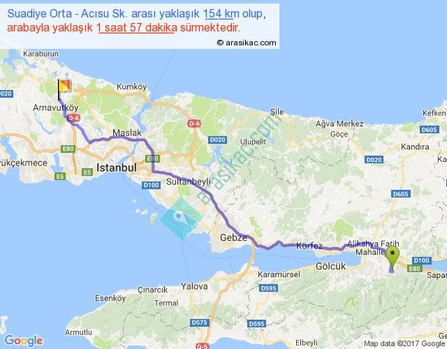 Suadiye Orta - Acısu Sk. arası yaklaşık olarak 90 km/h ile yukarıda belirtilen sürede olup, iki yerin kuş uçuşu uzaklığı (mesafesi) 123'dir. Yolculuk otobüsle 2 saat 32 dakika sürmektedir.