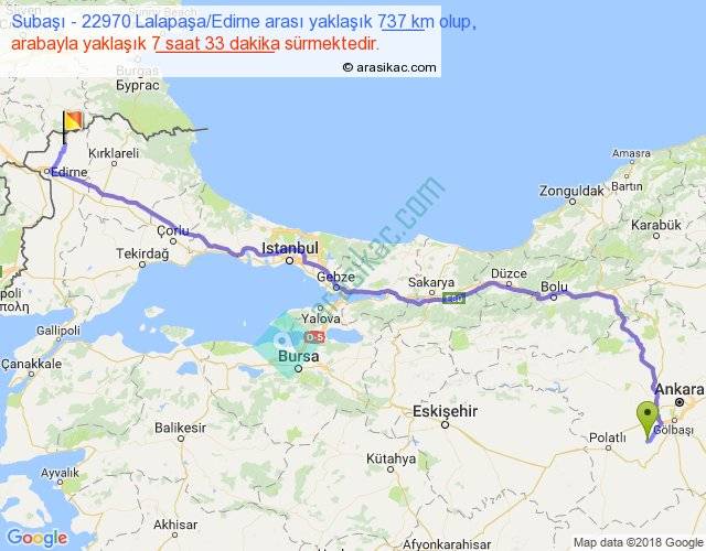 Subaşı - 22970 Lalapaşa Edirne arası yaklaşık olarak 90 km/h ile yukarıda belirtilen sürede olup, iki yerin kuş uçuşu uzaklığı (mesafesi) 545'dir. Eğer belirtilen yerler arasında uçak seferi var ise bu süre uçakla 50 dakika'ya kadar düşebilir. Yolculuk otobüsle 9 saat 48 dakika sürmektedir.