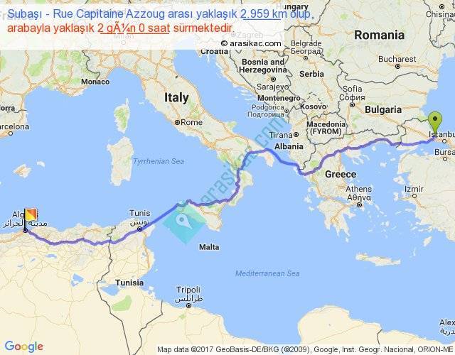 Subaşı - Rue Capitaine Azzoug arası yaklaşık olarak 90 km/h ile yukarıda belirtilen sürede olup, iki yerin kuş uçuşu uzaklığı (mesafesi) 2225'dir. Eğer belirtilen yerler arasında uçak seferi var ise bu süre uçakla 3 saat 25 dakika'ya kadar düşebilir. Yolculuk otobüsle 2 gün 14 saat sürmektedir.