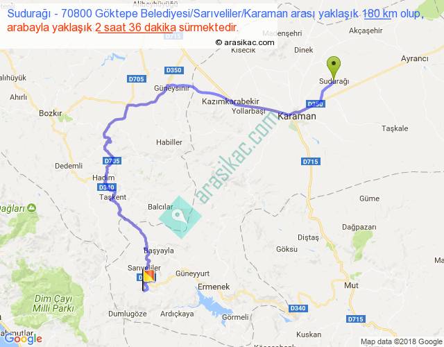 Sudurağı - 70800 Göktepe Belediyesi Sarıveliler Karaman arası yaklaşık olarak 90 km/h ile yukarıda belirtilen sürede olup, iki yerin kuş uçuşu uzaklığı (mesafesi) 99'dir. Yolculuk otobüsle 3 saat 22 dakika sürmektedir.