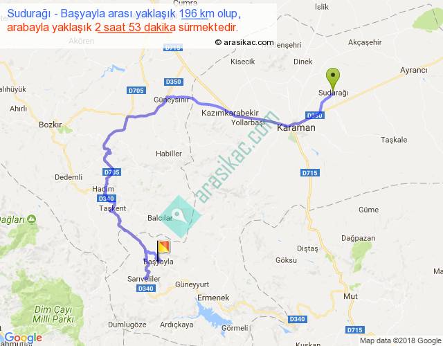 Sudurağı - Başyayla arası yaklaşık olarak 90 km/h ile yukarıda belirtilen sürede olup, iki yerin kuş uçuşu uzaklığı (mesafesi) 85'dir. Yolculuk otobüsle 3 saat 44 dakika sürmektedir.