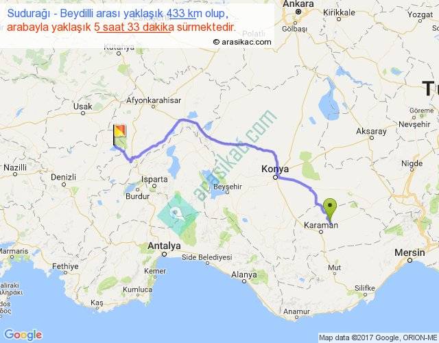 Sudurağı - Beydilli arası yaklaşık olarak 90 km/h ile yukarıda belirtilen sürede olup, iki yerin kuş uçuşu uzaklığı (mesafesi) 320'dir. Eğer belirtilen yerler arasında uçak seferi var ise bu süre uçakla 29 dakika'ya kadar düşebilir. Yolculuk otobüsle 7 saat 12 dakika sürmektedir.