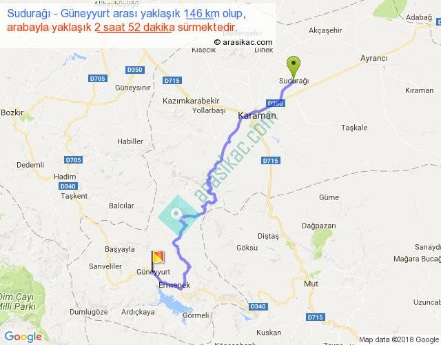 Sudurağı - Güneyyurt arası yaklaşık olarak 90 km/h ile yukarıda belirtilen sürede olup, iki yerin kuş uçuşu uzaklığı (mesafesi) 83'dir. Yolculuk otobüsle 3 saat 43 dakika sürmektedir.