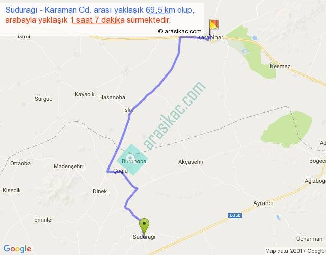 Sudurağı - Karaman Cd. arası yaklaşık olarak 90 km/h ile yukarıda belirtilen sürede olup, iki yerin kuş uçuşu uzaklığı (mesafesi) 50'dir. Yolculuk otobüsle 1 saat 27 dakika sürmektedir.