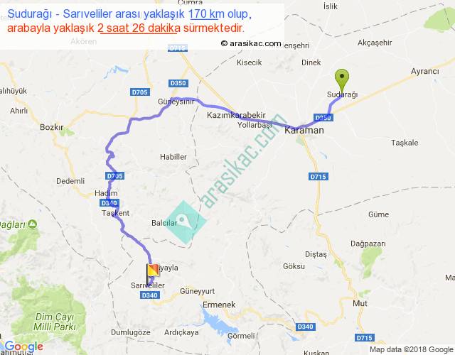 Sudurağı - Sarıveliler arası yaklaşık olarak 90 km/h ile yukarıda belirtilen sürede olup, iki yerin kuş uçuşu uzaklığı (mesafesi) 93'dir. Yolculuk otobüsle 3 saat 9 dakika sürmektedir.