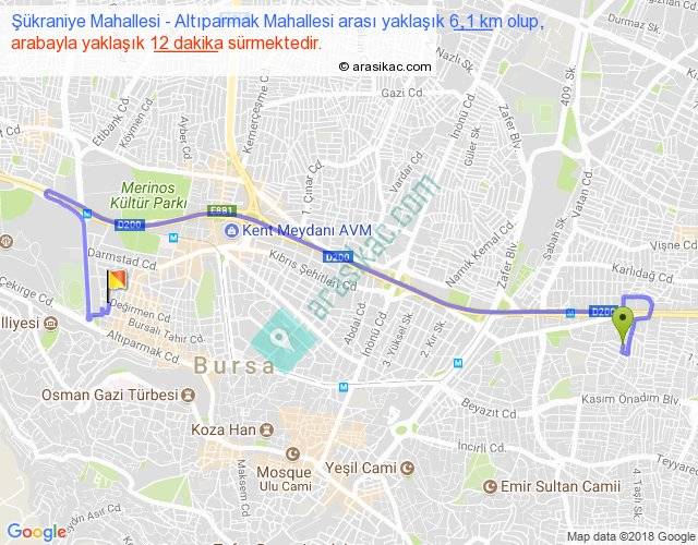 Şükraniye Mahallesi - Altıparmak Mahallesi arası yaklaşık olarak 90 km/h ile yukarıda belirtilen sürede olup, iki yerin kuş uçuşu uzaklığı (mesafesi) 3'dir. Yolculuk otobüsle 15 dakika sürmektedir.