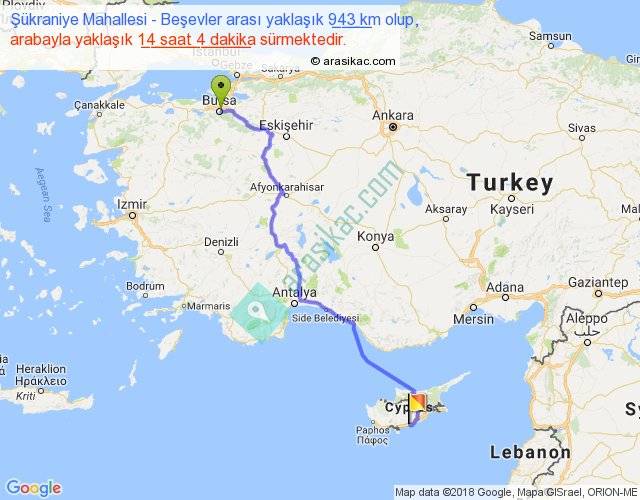 Şükraniye Mahallesi - Beşevler arası yaklaşık olarak 90 km/h ile yukarıda belirtilen sürede olup, iki yerin kuş uçuşu uzaklığı (mesafesi) 704'dir. Eğer belirtilen yerler arasında uçak seferi var ise bu süre uçakla 1 saat 04 dakika'ya kadar düşebilir. Yolculuk otobüsle 18 saat 17 dakika sürmektedir.