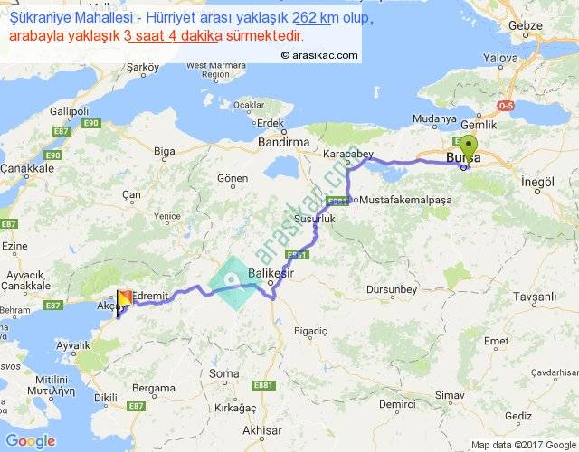 Şükraniye Mahallesi - Hürriyet arası yaklaşık olarak 90 km/h ile yukarıda belirtilen sürede olup, iki yerin kuş uçuşu uzaklığı (mesafesi) 196'dir. Yolculuk otobüsle 3 saat 59 dakika sürmektedir.