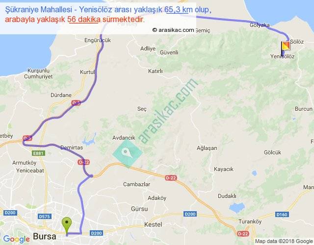 Şükraniye Mahallesi - Yenisölöz arası yaklaşık olarak 90 km/h ile yukarıda belirtilen sürede olup, iki yerin kuş uçuşu uzaklığı (mesafesi) 33'dir. Yolculuk otobüsle 1 saat 12 dakika sürmektedir.