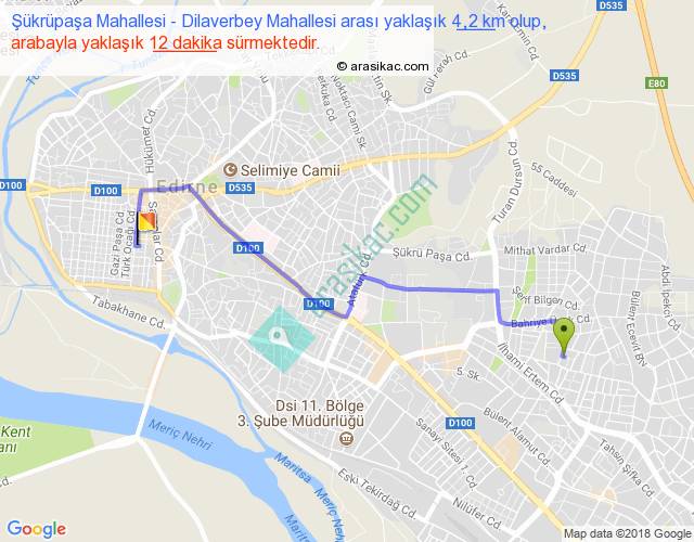 Şükrüpaşa Mahallesi - Dilaverbey Mahallesi arası yaklaşık olarak 90 km/h ile yukarıda belirtilen sürede olup, iki yerin kuş uçuşu uzaklığı (mesafesi) 3'dir. Yolculuk otobüsle 15 dakika sürmektedir.