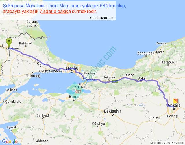 Şükrüpaşa Mahallesi - İncirli Mah. arası yaklaşık olarak 90 km/h ile yukarıda belirtilen sürede olup, iki yerin kuş uçuşu uzaklığı (mesafesi) 556'dir. Eğer belirtilen yerler arasında uçak seferi var ise bu süre uçakla 51 dakika'ya kadar düşebilir. Yolculuk otobüsle 9 saat 6 dakika sürmektedir.