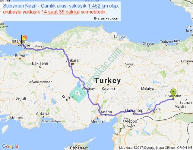 Süleyman Nazif - Çamlık arası yaklaşık olarak 90 km/h ile yukarıda belirtilen sürede olup, iki yerin kuş uçuşu uzaklığı (mesafesi) 1002'dir. Eğer belirtilen yerler arasında uçak seferi var ise bu süre uçakla 1 saat 32 dakika'ya kadar düşebilir. Yolculuk otobüsle 19 saat 2 dakika sürmektedir.