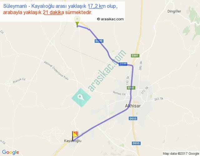 Süleymanlı - Kayalıoğlu arası yaklaşık olarak 90 km/h ile yukarıda belirtilen sürede olup, iki yerin kuş uçuşu uzaklığı (mesafesi) 11'dir. Yolculuk otobüsle 27 dakika sürmektedir.