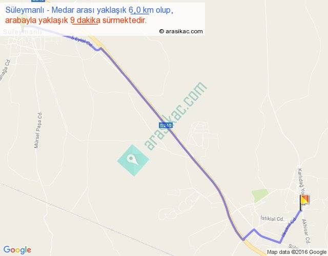 Süleymanlı - Medar arası yaklaşık olarak 90 km/h ile yukarıda belirtilen sürede olup, iki yerin kuş uçuşu uzaklığı (mesafesi) 5'dir. Yolculuk otobüsle 11 dakika sürmektedir.
