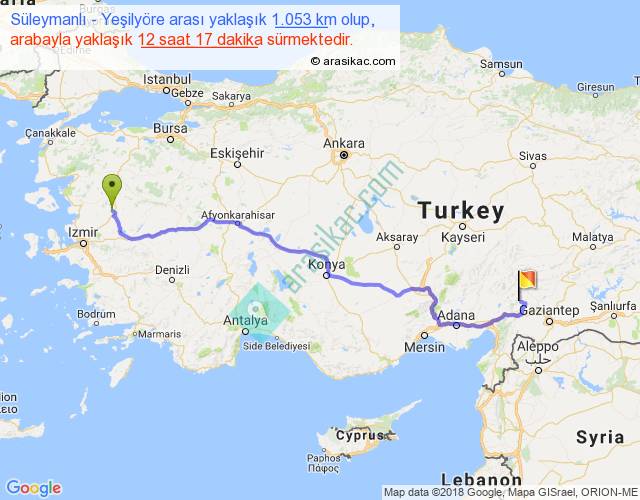Süleymanlı - Yeşilyöre arası yaklaşık olarak 90 km/h ile yukarıda belirtilen sürede olup, iki yerin kuş uçuşu uzaklığı (mesafesi) 798'dir. Eğer belirtilen yerler arasında uçak seferi var ise bu süre uçakla 1 saat 13 dakika'ya kadar düşebilir. Yolculuk otobüsle 15 saat 58 dakika sürmektedir.