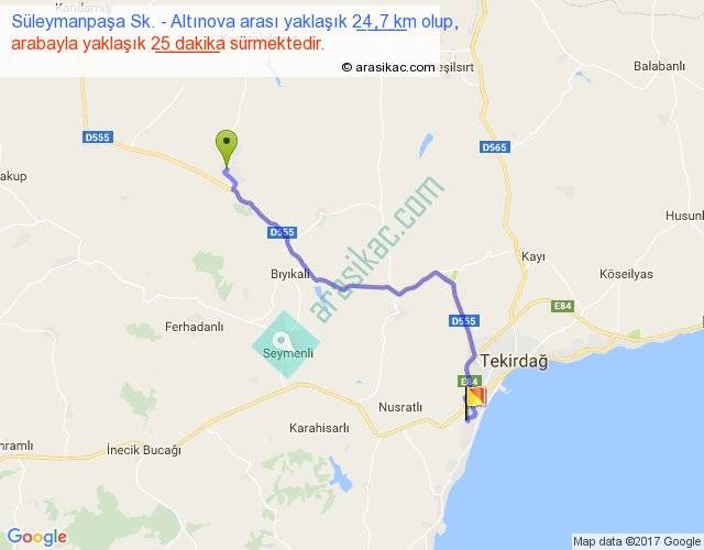Süleymanpaşa Sk. - Altınova arası yaklaşık olarak 90 km/h ile yukarıda belirtilen sürede olup, iki yerin kuş uçuşu uzaklığı (mesafesi) 18'dir. Yolculuk otobüsle 32 dakika sürmektedir.