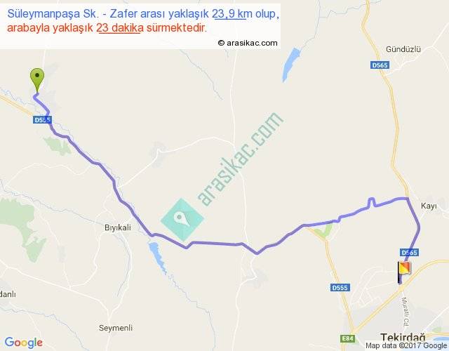Süleymanpaşa Sk. - Zafer arası yaklaşık olarak 90 km/h ile yukarıda belirtilen sürede olup, iki yerin kuş uçuşu uzaklığı (mesafesi) 17'dir. Yolculuk otobüsle 29 dakika sürmektedir.