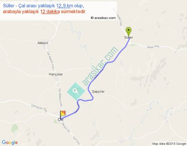Süller - Çal arası yaklaşık olarak 90 km/h ile yukarıda belirtilen sürede olup, iki yerin kuş uçuşu uzaklığı (mesafesi) 11'dir. Yolculuk otobüsle 15 dakika sürmektedir.