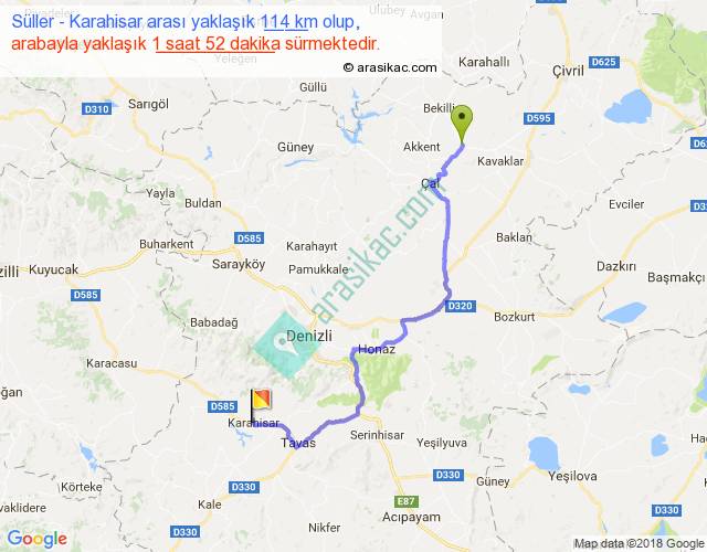 Süller - Karahisar arası yaklaşık olarak 90 km/h ile yukarıda belirtilen sürede olup, iki yerin kuş uçuşu uzaklığı (mesafesi) 75'dir. Yolculuk otobüsle 2 saat 25 dakika sürmektedir.