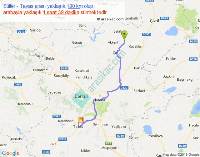 Süller - Tavas arası yaklaşık olarak 90 km/h ile yukarıda belirtilen sürede olup, iki yerin kuş uçuşu uzaklığı (mesafesi) 74'dir. Yolculuk otobüsle 2 saat 8 dakika sürmektedir.