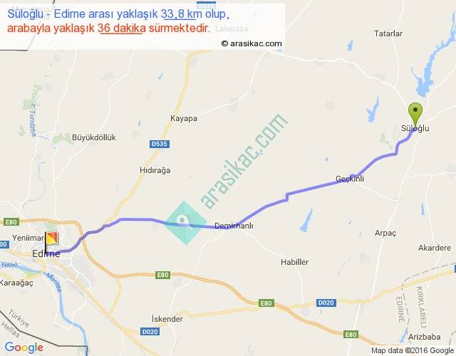 Süloğlu - Edirne arası yaklaşık olarak 90 km/h ile yukarıda belirtilen sürede olup, iki yerin kuş uçuşu uzaklığı (mesafesi) 31'dir. Yolculuk otobüsle 46 dakika sürmektedir.