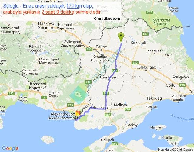 Süloğlu - Enez arası yaklaşık olarak 90 km/h ile yukarıda belirtilen sürede olup, iki yerin kuş uçuşu uzaklığı (mesafesi) 134'dir. Yolculuk otobüsle 2 saat 47 dakika sürmektedir.