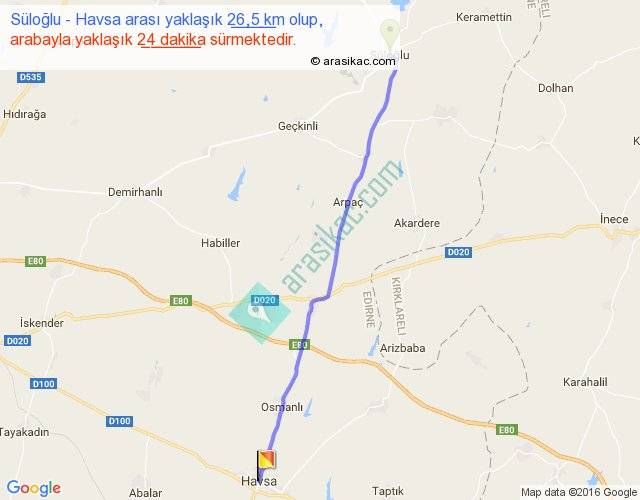 Süloğlu - Havsa arası yaklaşık olarak 90 km/h ile yukarıda belirtilen sürede olup, iki yerin kuş uçuşu uzaklığı (mesafesi) 25'dir. Yolculuk otobüsle 31 dakika sürmektedir.