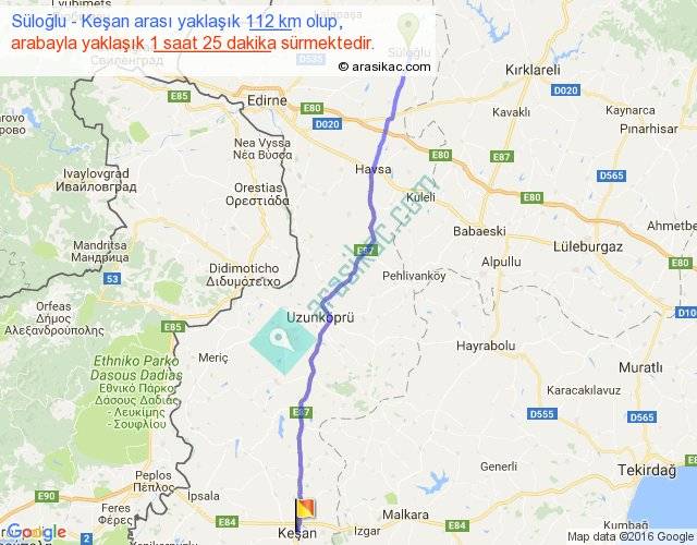 Süloğlu - Keşan arası yaklaşık olarak 90 km/h ile yukarıda belirtilen sürede olup, iki yerin kuş uçuşu uzaklığı (mesafesi) 103'dir. Yolculuk otobüsle 1 saat 50 dakika sürmektedir.