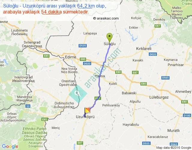 Süloğlu - Uzunköprü arası yaklaşık olarak 90 km/h ile yukarıda belirtilen sürede olup, iki yerin kuş uçuşu uzaklığı (mesafesi) 58'dir. Yolculuk otobüsle 1 saat 10 dakika sürmektedir.