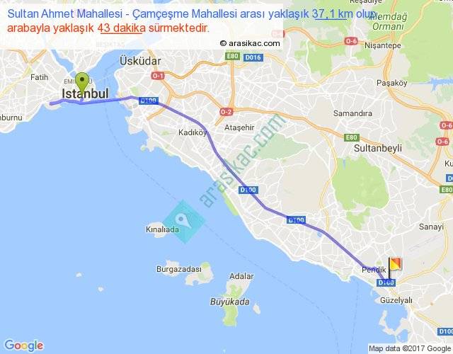 Sultan Ahmet Mahallesi - Çamçeşme Mahallesi arası yaklaşık olarak 90 km/h ile yukarıda belirtilen sürede olup, iki yerin kuş uçuşu uzaklığı (mesafesi) 29'dir. Yolculuk otobüsle 55 dakika sürmektedir.