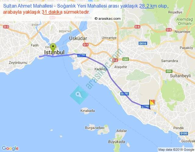 Sultan Ahmet Mahallesi - Soğanlık Yeni Mahallesi arası yaklaşık olarak 90 km/h ile yukarıda belirtilen sürede olup, iki yerin kuş uçuşu uzaklığı (mesafesi) 21'dir. Yolculuk otobüsle 40 dakika sürmektedir.