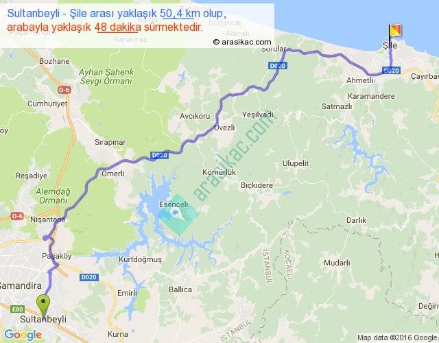 Sultanbeyli - Şile arası yaklaşık olarak 90 km/h ile yukarıda belirtilen sürede olup, iki yerin kuş uçuşu uzaklığı (mesafesi) 37'dir. Yolculuk otobüsle 1 saat 2 dakika sürmektedir.