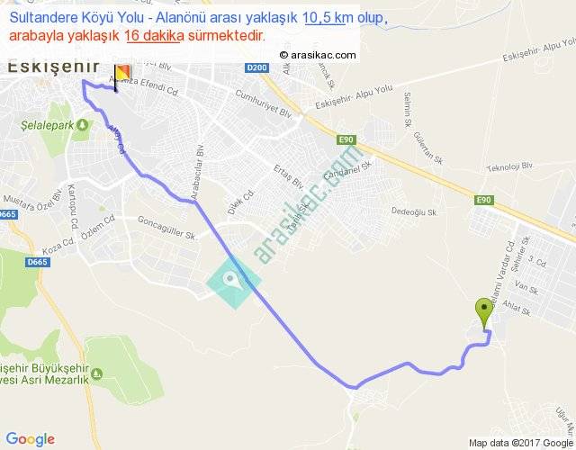 Sultandere Köyü Yolu - Alanönü arası yaklaşık olarak 90 km/h ile yukarıda belirtilen sürede olup, iki yerin kuş uçuşu uzaklığı (mesafesi) 7'dir. Yolculuk otobüsle 20 dakika sürmektedir.
