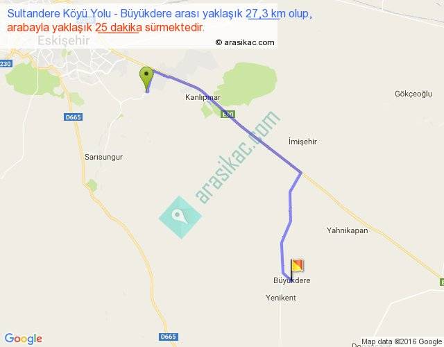 Sultandere Köyü Yolu - Büyükdere arası yaklaşık olarak 90 km/h ile yukarıda belirtilen sürede olup, iki yerin kuş uçuşu uzaklığı (mesafesi) 20'dir. Yolculuk otobüsle 32 dakika sürmektedir.