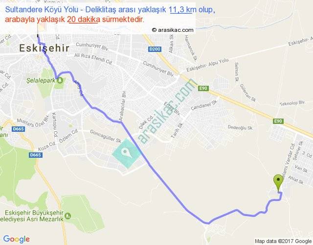 Sultandere Köyü Yolu - Deliklitaş arası yaklaşık olarak 90 km/h ile yukarıda belirtilen sürede olup, iki yerin kuş uçuşu uzaklığı (mesafesi) 9'dir. Yolculuk otobüsle 26 dakika sürmektedir.