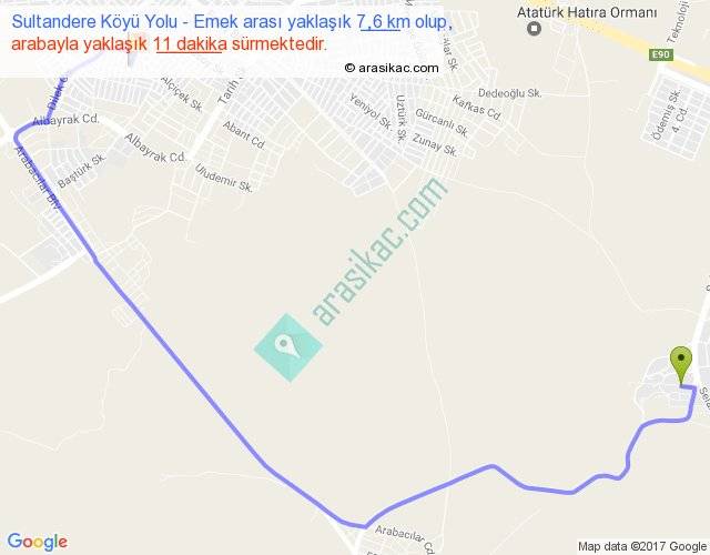 Sultandere Köyü Yolu - Emek arası yaklaşık olarak 90 km/h ile yukarıda belirtilen sürede olup, iki yerin kuş uçuşu uzaklığı (mesafesi) 4'dir. Yolculuk otobüsle 14 dakika sürmektedir.