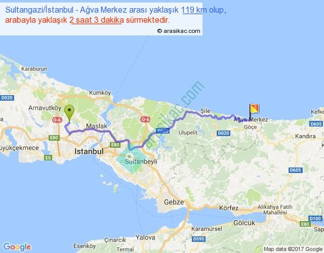 Sultangazi İstanbul - Ağva Merkez arası yaklaşık olarak 90 km/h ile yukarıda belirtilen sürede olup, iki yerin kuş uçuşu uzaklığı (mesafesi) 82'dir. Yolculuk otobüsle 2 saat 39 dakika sürmektedir.