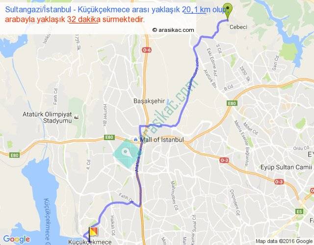 Sultangazi İstanbul - Küçükçekmece arası yaklaşık olarak 90 km/h ile yukarıda belirtilen sürede olup, iki yerin kuş uçuşu uzaklığı (mesafesi) 15'dir. Yolculuk otobüsle 41 dakika sürmektedir.