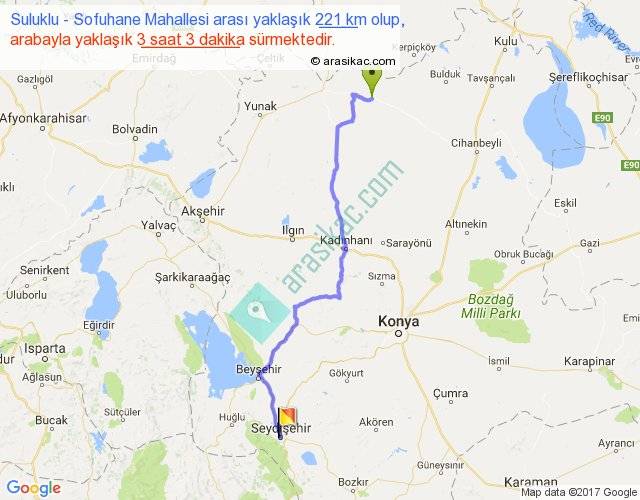 Suluklu - Sofuhane Mahallesi arası yaklaşık olarak 90 km/h ile yukarıda belirtilen sürede olup, iki yerin kuş uçuşu uzaklığı (mesafesi) 168'dir. Yolculuk otobüsle 3 saat 57 dakika sürmektedir.