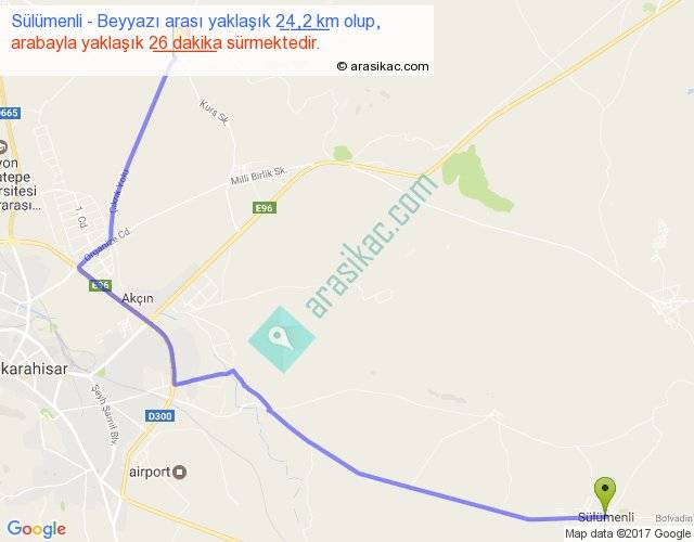 Sülümenli - Beyyazı arası yaklaşık olarak 90 km/h ile yukarıda belirtilen sürede olup, iki yerin kuş uçuşu uzaklığı (mesafesi) 17'dir. Yolculuk otobüsle 33 dakika sürmektedir.