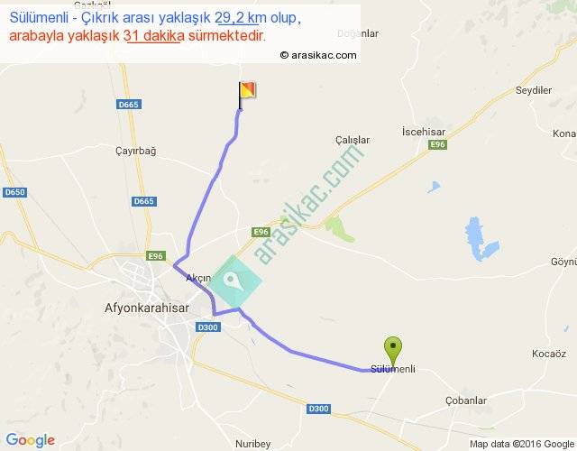 Sülümenli - Çıkrık arası yaklaşık olarak 90 km/h ile yukarıda belirtilen sürede olup, iki yerin kuş uçuşu uzaklığı (mesafesi) 20'dir. Yolculuk otobüsle 40 dakika sürmektedir.