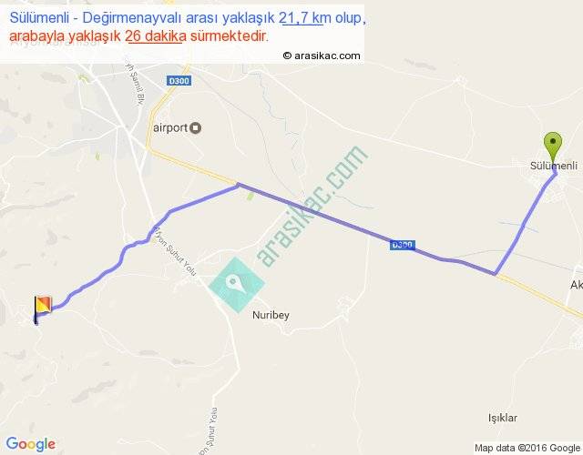 Sülümenli - Değirmenayvalı arası yaklaşık olarak 90 km/h ile yukarıda belirtilen sürede olup, iki yerin kuş uçuşu uzaklığı (mesafesi) 18'dir. Yolculuk otobüsle 33 dakika sürmektedir.