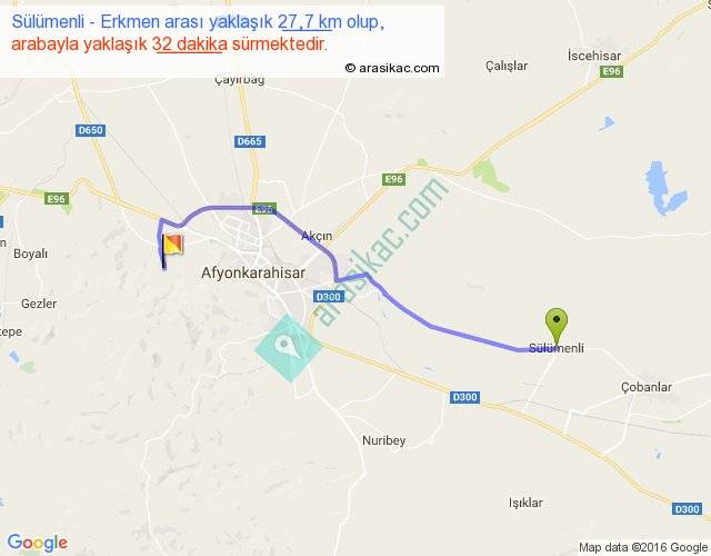 Sülümenli - Erkmen arası yaklaşık olarak 90 km/h ile yukarıda belirtilen sürede olup, iki yerin kuş uçuşu uzaklığı (mesafesi) 21'dir. Yolculuk otobüsle 41 dakika sürmektedir.