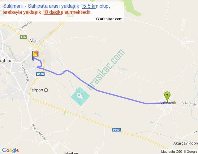 Sülümenli - Sahipata arası yaklaşık olarak 90 km/h ile yukarıda belirtilen sürede olup, iki yerin kuş uçuşu uzaklığı (mesafesi) 13'dir. Yolculuk otobüsle 23 dakika sürmektedir.