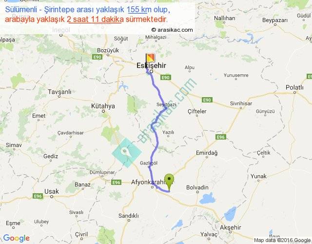 Sülümenli - Şirintepe arası yaklaşık olarak 90 km/h ile yukarıda belirtilen sürede olup, iki yerin kuş uçuşu uzaklığı (mesafesi) 120'dir. Yolculuk otobüsle 2 saat 50 dakika sürmektedir.