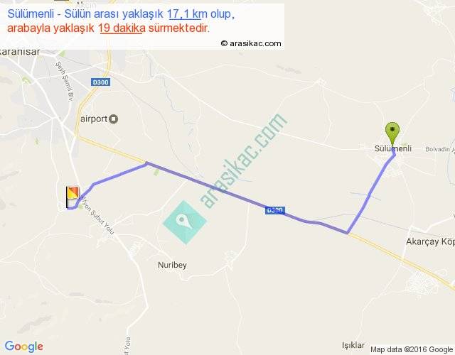Sülümenli - Sülün arası yaklaşık olarak 90 km/h ile yukarıda belirtilen sürede olup, iki yerin kuş uçuşu uzaklığı (mesafesi) 14'dir. Yolculuk otobüsle 24 dakika sürmektedir.