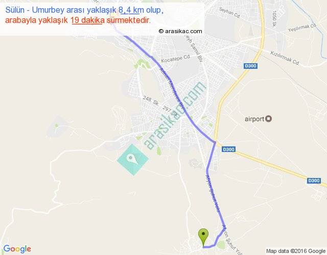 Sülün - Umurbey arası yaklaşık olarak 90 km/h ile yukarıda belirtilen sürede olup, iki yerin kuş uçuşu uzaklığı (mesafesi) 7'dir. Yolculuk otobüsle 24 dakika sürmektedir.